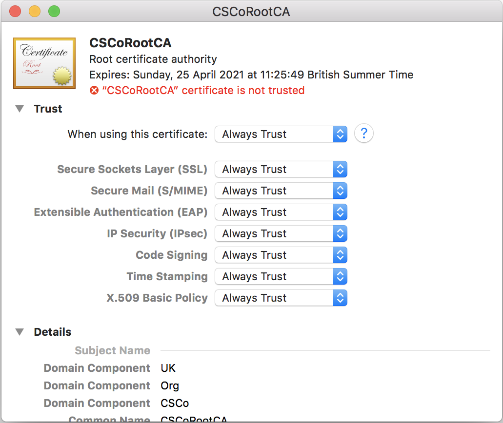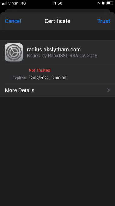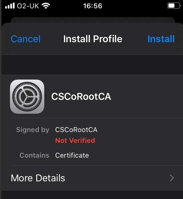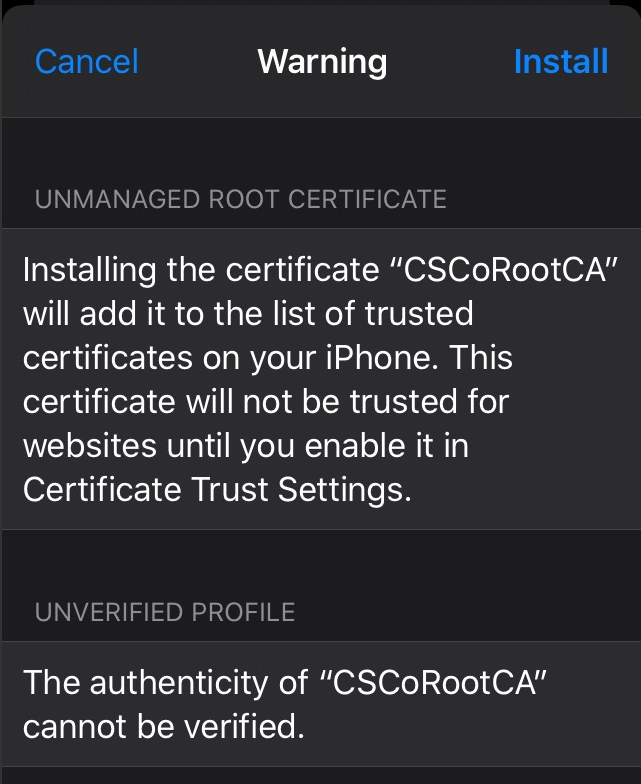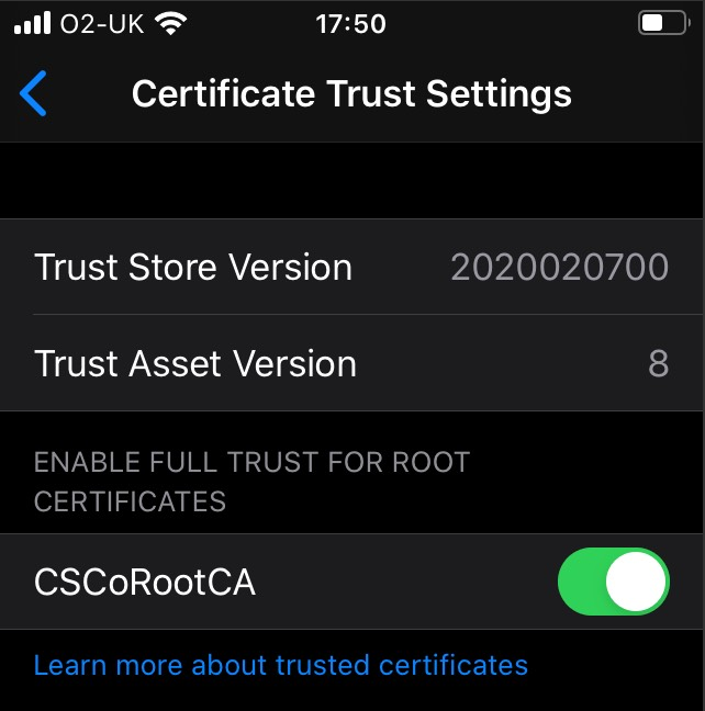 - Finally in Settings go to General ->About -> Certificate Trust Settings (bottom of the screen) and enable CSCoRootCA: