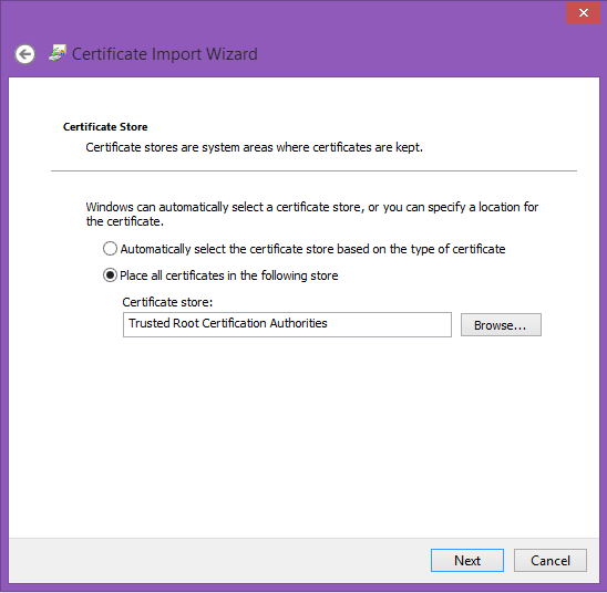 - Select Place all certificates in the following store, then browse for Trusted Root Certification Authorities: